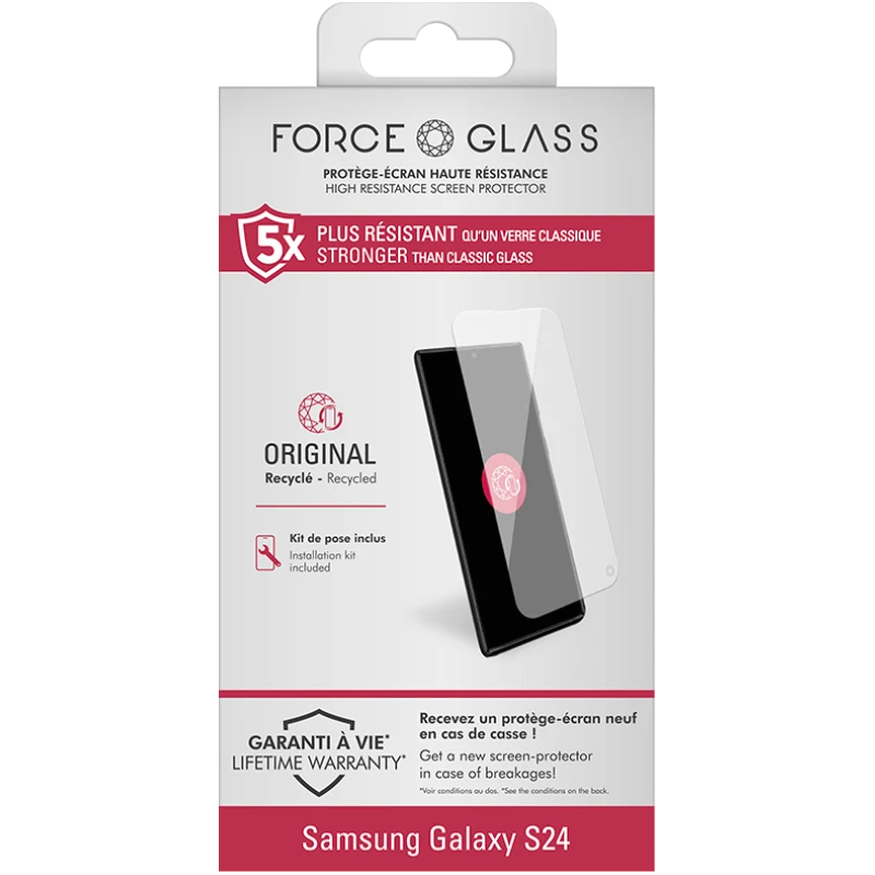 1 protège écran Garanti à vie + 1 kit de nettoyage + 1 adhésif antistatique + 1 kit de pose biodégradable exclusif dédié