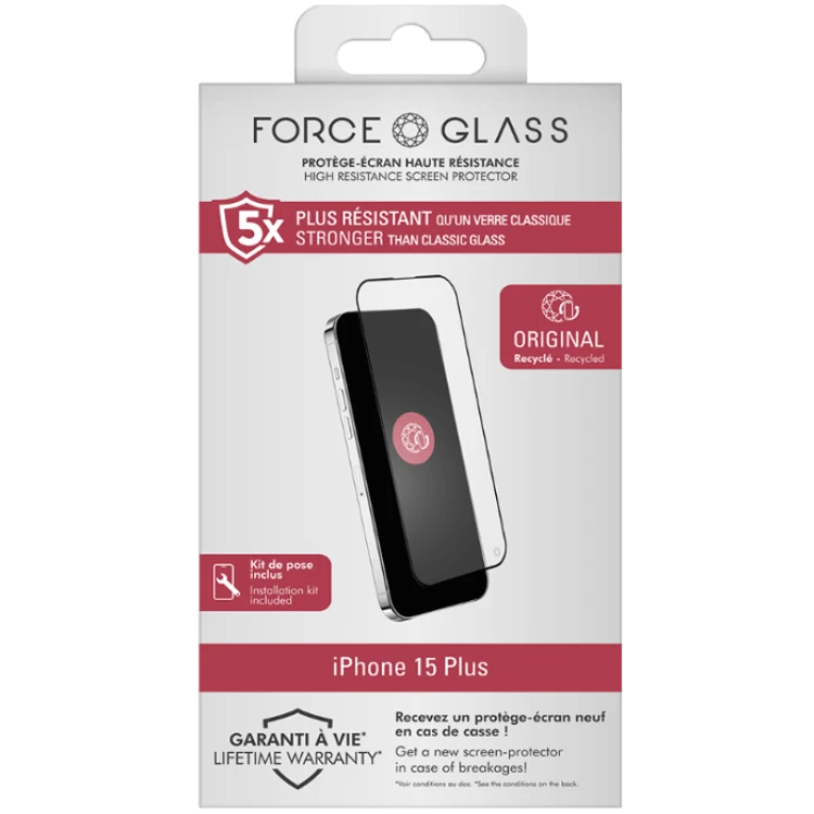 Force Glass Protège-écran en verre organique recyclé pour Apple iPhone 16 Plus/15 Plus/14 Pro Max