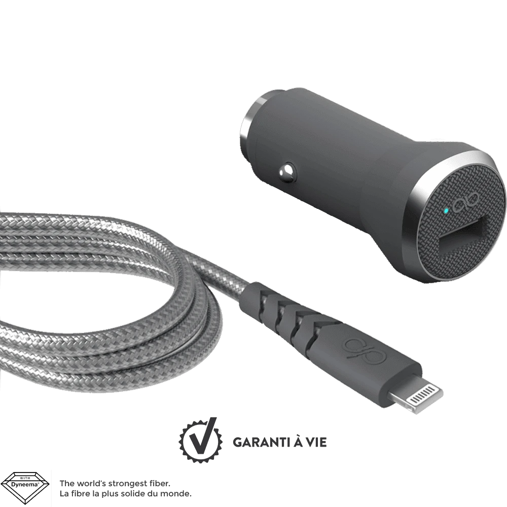 Les caractéristiques du Chargeur voiture et câble renforcé USB A/Lightning