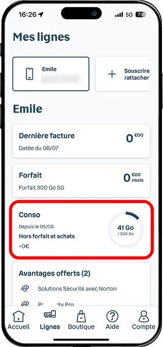 l’application Bouygues Telecom et accédez à votre espace Lignes puis cliquez sur Conso.